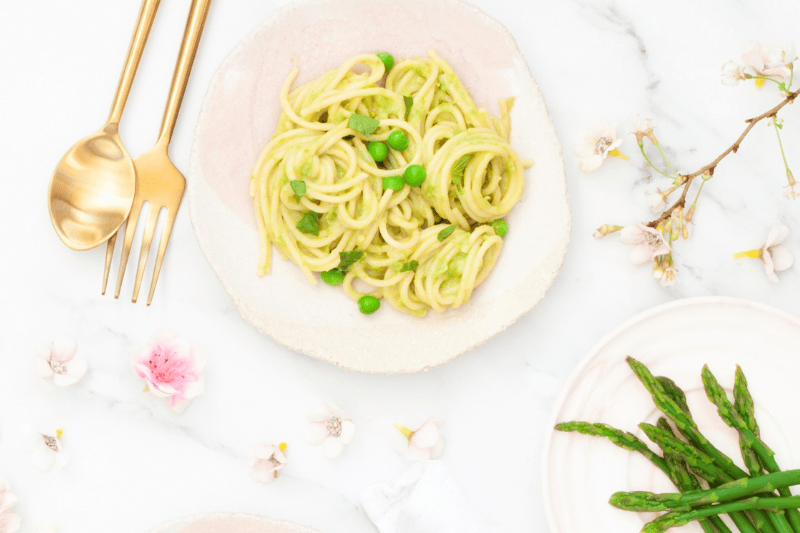 Creamy avocado and spring green pasta